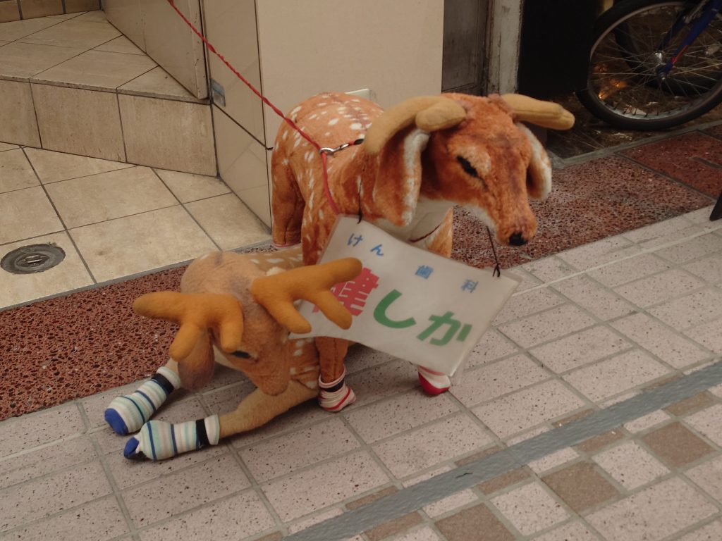 パルム商店街内、直近まで「保険deあんしん館」が営業していた場所とみられます。auショップのとなり、2階には「健歯科」があり鹿のぬいぐるみが設置されているところです。