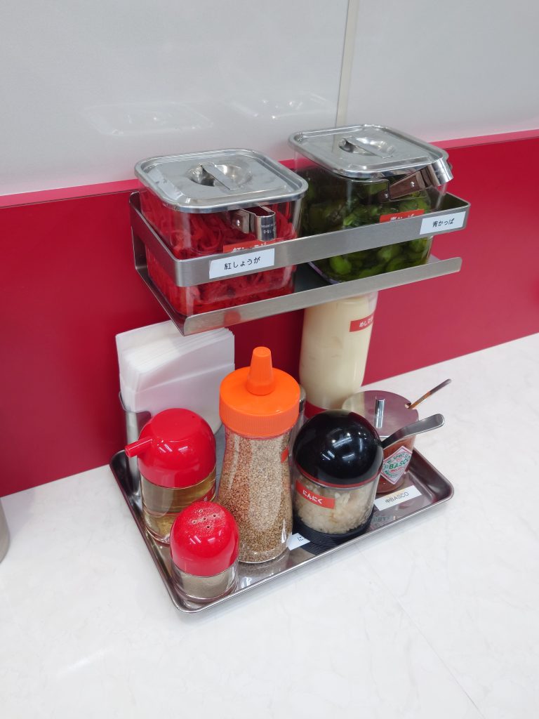 卓上には漬物やマヨネーズ、ニンニクなどが置かれています。通な方はライスの上にチャーシューを移動させ、マヨネーズを掛けて食べるようです。マヨネーズは少し酸味が効いた、ややあっさりとした味でした。ライスはおかわりもできるので、漬物やマヨネーズ、スープと掛けると無限に食べられると思います。